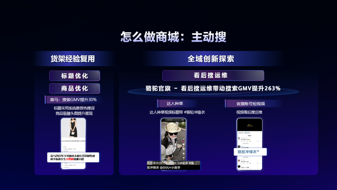 货架场景给作者带来切实增长,创作者就可以通过内容场和货架场景的场域协同联动,把内容创作延伸到货架场景;所以更能实现种拔草一体化,加上搜索运营的助力,实现更高效、精准的内容GMV转化。