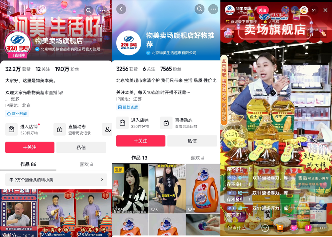 物美超市在抖音主要有2个账号,粉丝超过19万,视频内容主要是物美脱口秀直播回放、活动宣传、产品安利等,主账号也会定期开启直播卖货。
