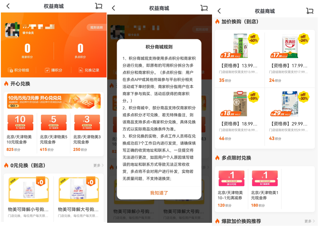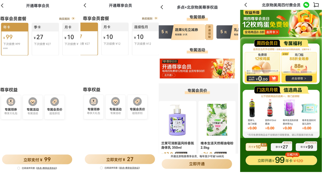 物美超市的会员体系主要是在自开发的“多点”APP中,以付费会员+成长型会员+积分模式为主。