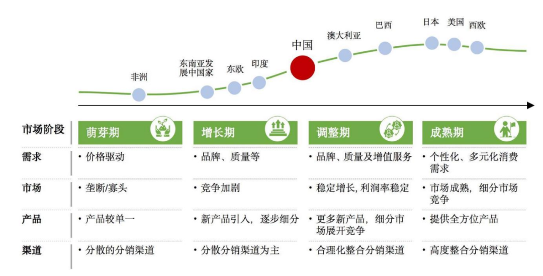 第三个阶段是调整期,用户诉求更多、更细化。主体市场格局的形成使很多行业开始保持稳定增长,利润率也逐步趋于稳定,进一步的竞争往往存在于细分市场中。细分市场不断涌现新品,渠道结构也进一步趋于满足用户需求的合理化整合。