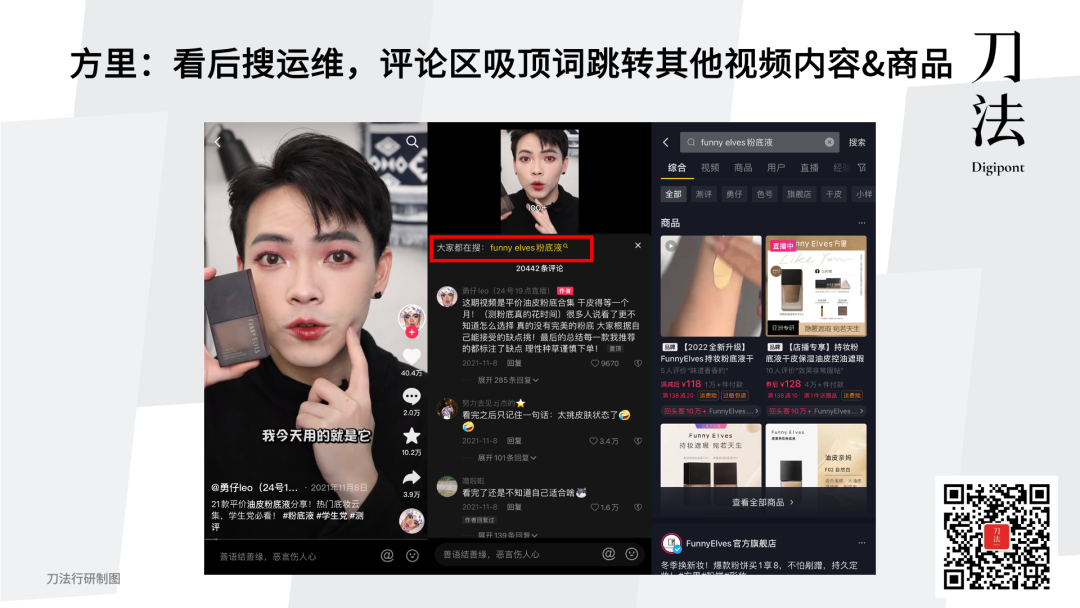 于是方里通过铺设大量趣味性、互动性以及热点时效性的 KOC/KOL 短视频内容,提升商品搜索词,然后通过“看后搜”运维,在视频评论区设置吸顶词、小蓝字超链接,提高潜在用户通过搜索快速触达品牌直播间和其他短视频的几率,进行二次转化。