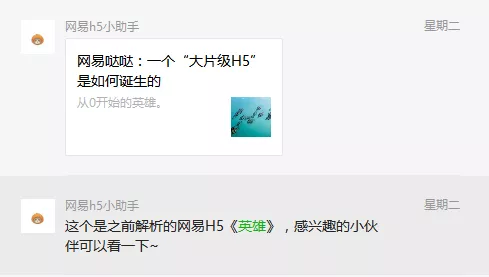 比如我们的H5行业情报群,每晚都会分享一篇干货文章,免费讲解案例。哒哒最新H5《英雄》复盘文章在第一时间分享在群中。