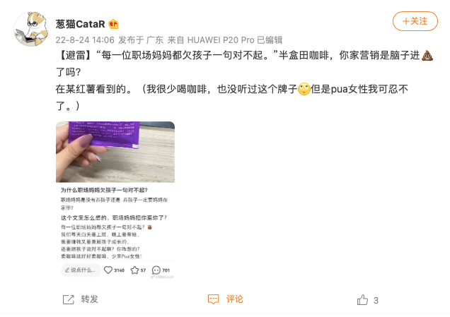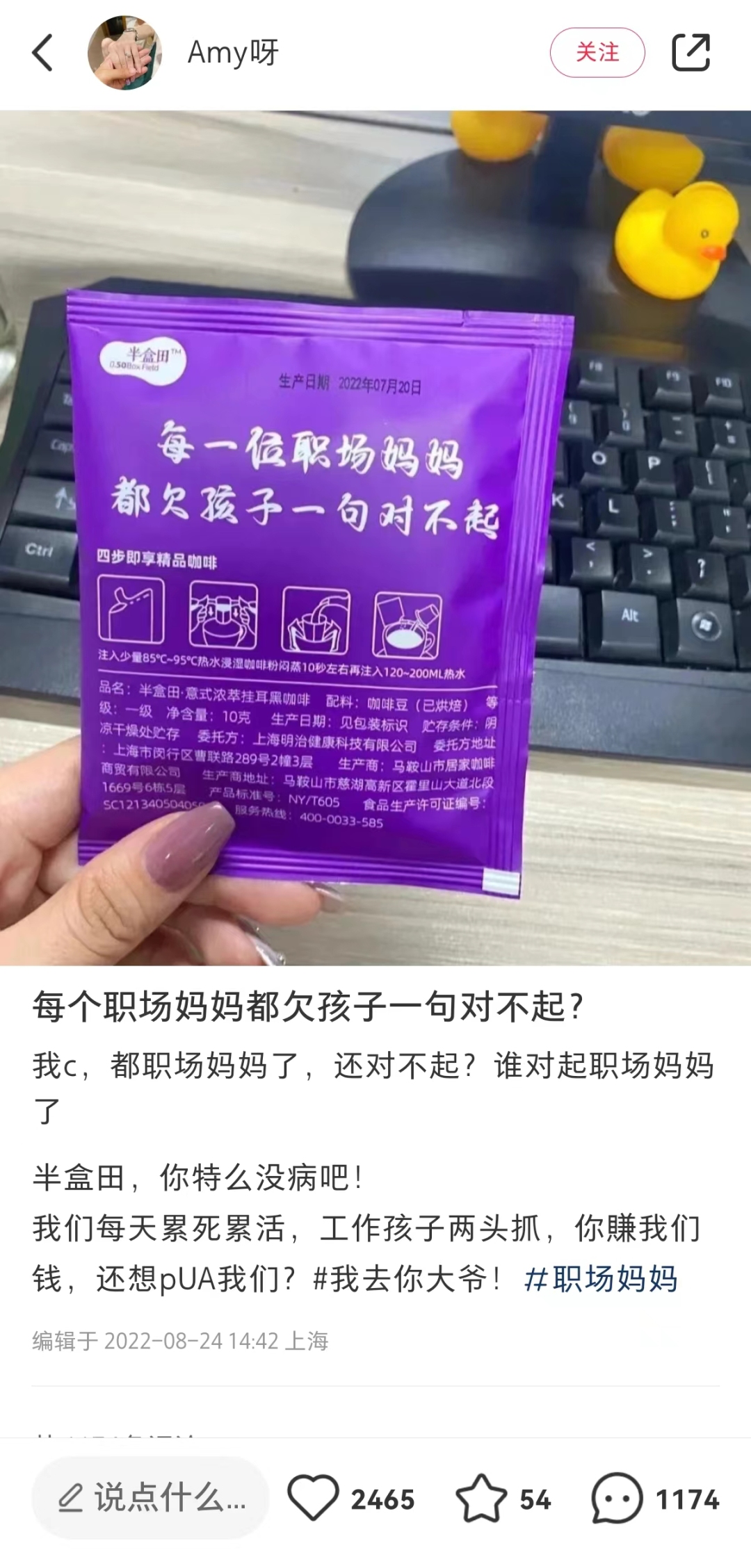 8月24日(14点42分这是编辑时间,无法估计具体发布时间),一位名叫“amy呀”的网友,在小红书晒出一张图,她手持一个咖啡品牌的外包装,上面赫然写着一句文案:“每一个职场妈妈都欠孩子一句对不起”。(又是小红书,这里划重点)