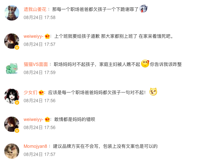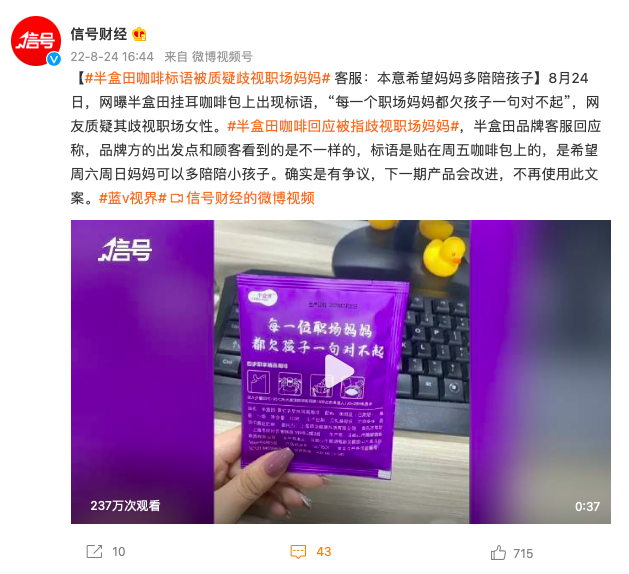 “品牌方的出发点和顾客看到的是不一样的,标语是贴在周五咖啡包上的,是希望周六周日妈妈可以多陪陪小孩子。确实是有争议,下一期产品会改进,不再使用此文案。”