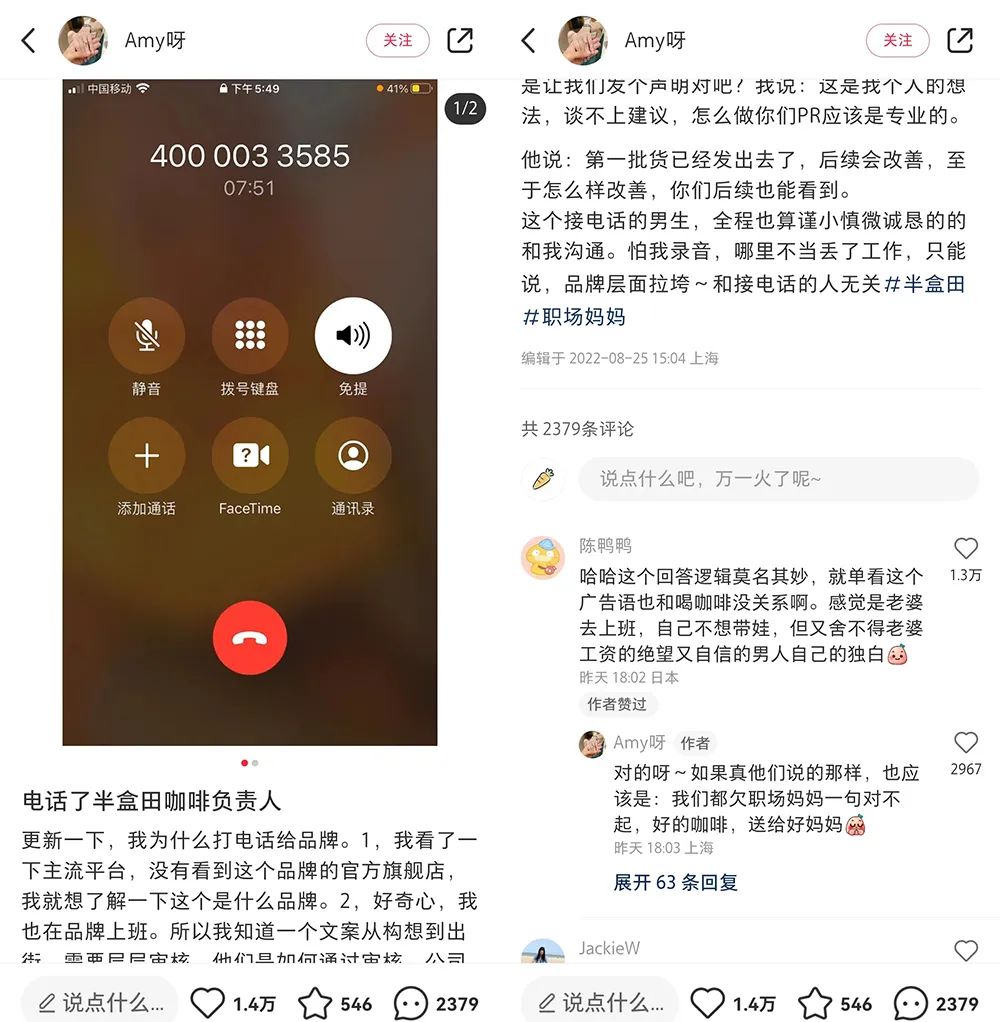 大叔看到,不仅是首位曝光此事的小红书博主专门给半盒田咖啡的客服打了电话,详细记录了经过。