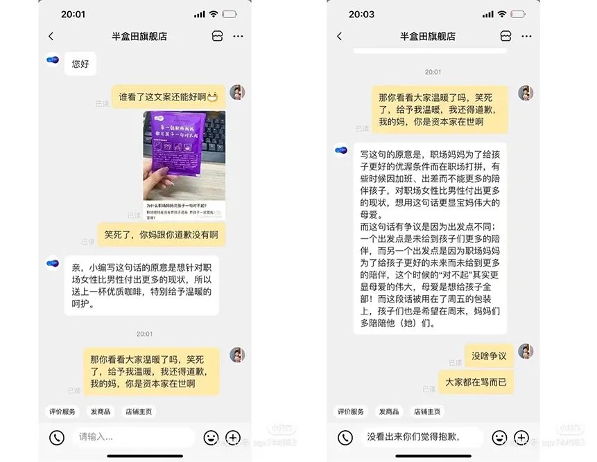 也有小红书博主主动晒出,自己与半盒旗舰店的聊天记录,还挺解气的。