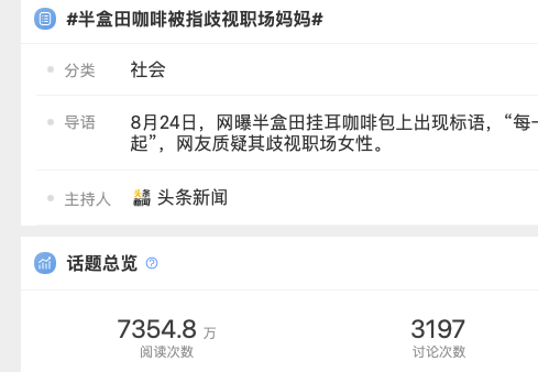 微博上,#半盒田咖啡被指歧视职场妈妈#接近8000万讨论量,从大叔多个社群的反应来看,数据绝对有失真,因为但凡有群友提及此事,就会掀起一大串的讨论,几乎全是对品牌的负面评论。