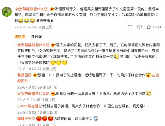 但马上就有网友指出,外网的两版声明与中文道歉声明不一致,刻意不提自己是中国品牌。(这里划重点)