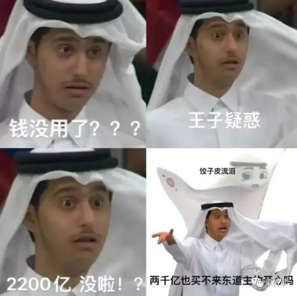 卡塔尔一上场就输掉了比赛,成了世界杯首支输掉揭幕战的东道主球队。他们的小王子因为接受不了这个拉胯的结果,露出了这个惊愕的表情。卡塔尔小王子因为这个表情包,在抖音涨粉1000多万。