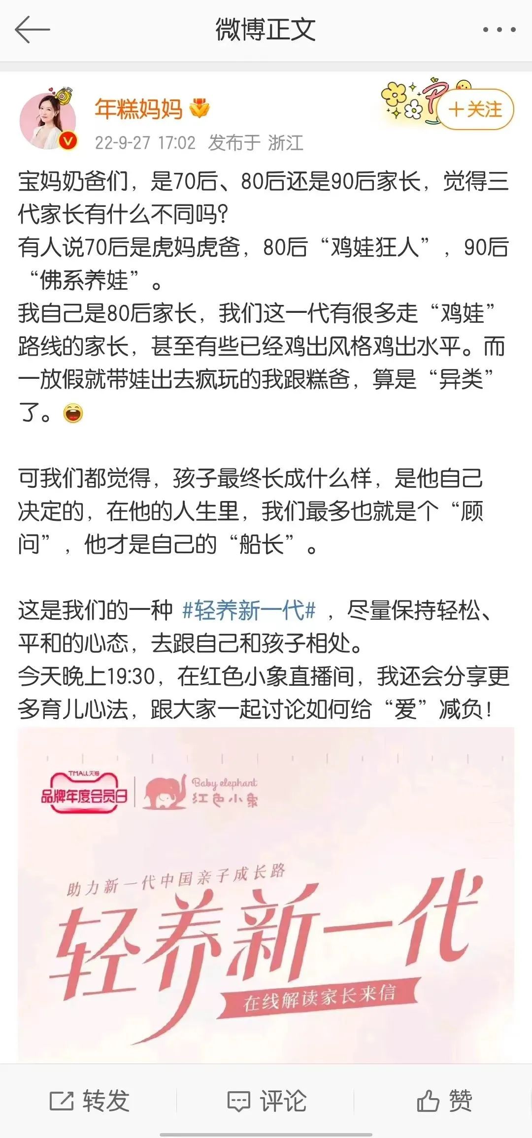 进一步延续微博话题热度,红色小象还以#轻养新一代#为话题场域,准确击中当下母婴类人群。在各类KOL的内容扩散下,再次牵动全网热度,也为红色小象的品牌升级带去关注。