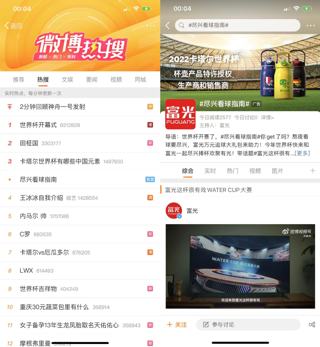 在微博这一全网热点聚集地,富光发布的#尽兴看球指南#一度霸榜热搜榜,万元追球大礼包更是吸引了众多球迷的注意力。