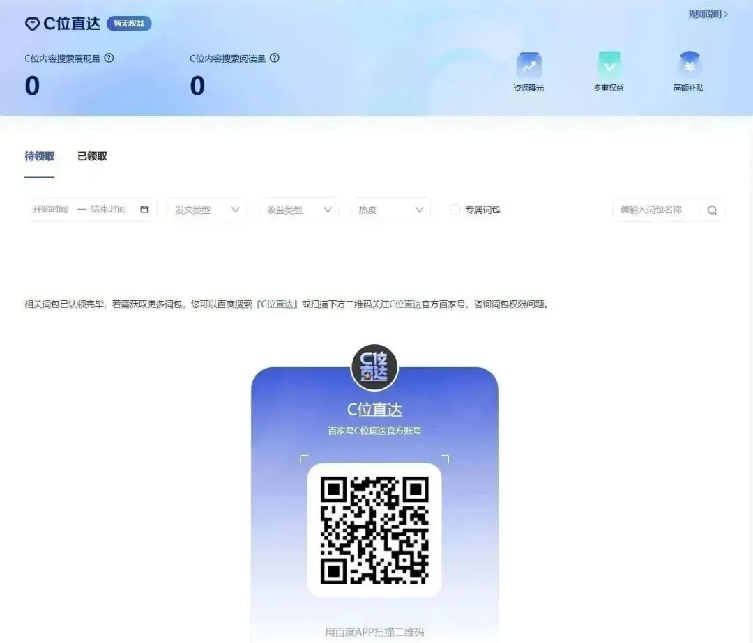 C位直达是百度搜索和百家号联合推出的内容生产计划,激励百家号优质创作者对搜索高频稀缺问题进行定向内容创作,创作者认领词包之后发布内容和摘要,搜索审核通过后即可解锁五大权益激励哦!