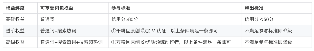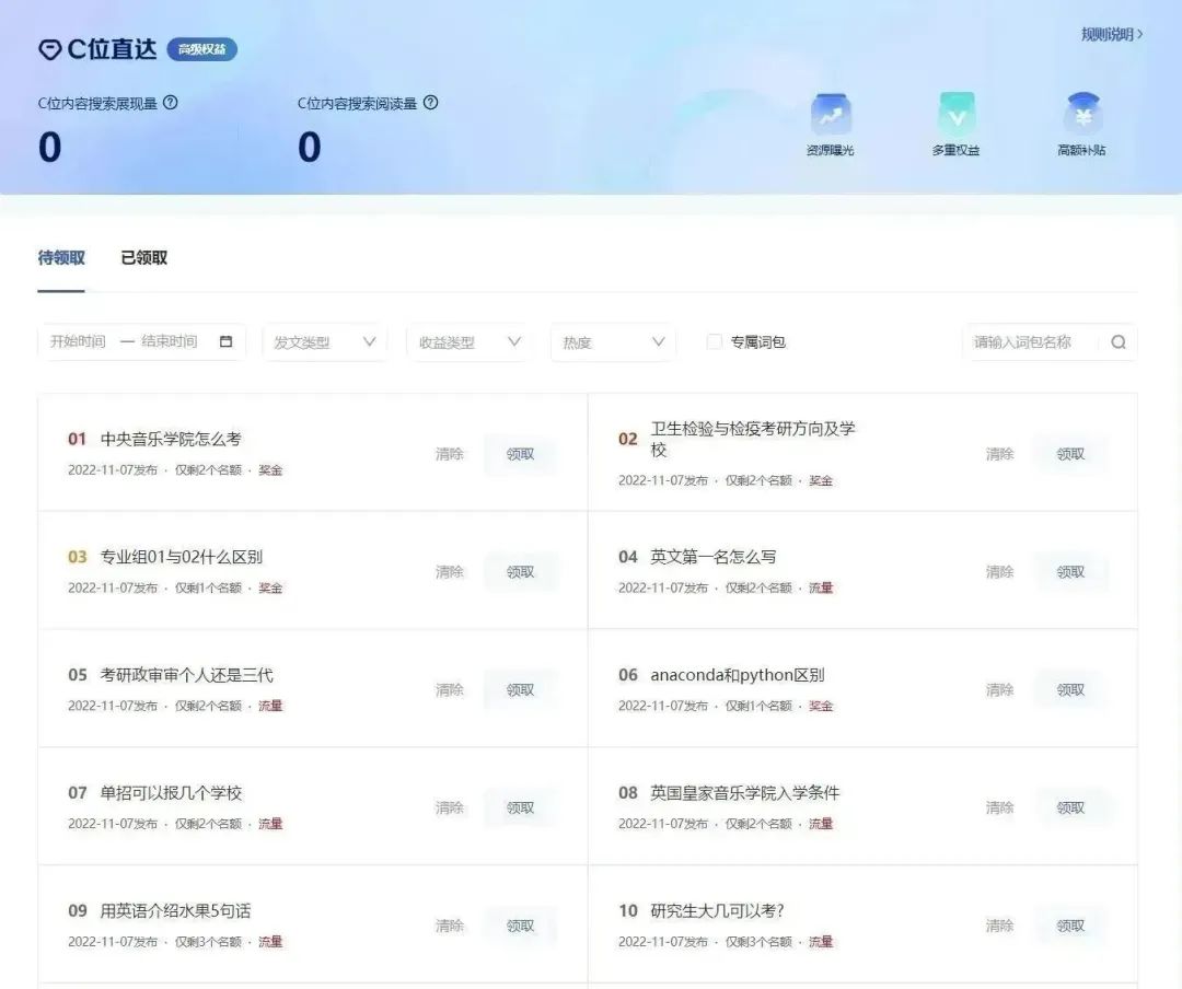 为了让C位直达覆盖到平台更多优质作者,官方根据账号信用分、粉丝数、原创、认证等信号制定不同作者可领取的词包范围。