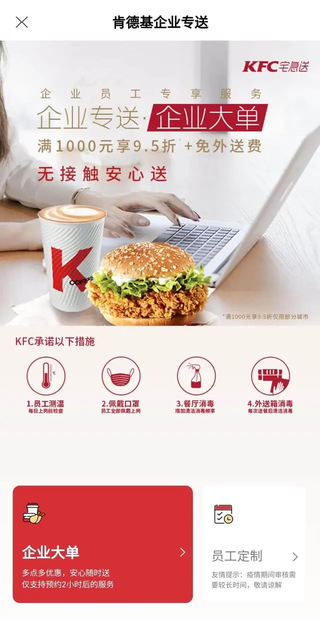 此外肯德基一直在积极拓展新的业务场景,在2019年就创新提供“企业专送”服务。