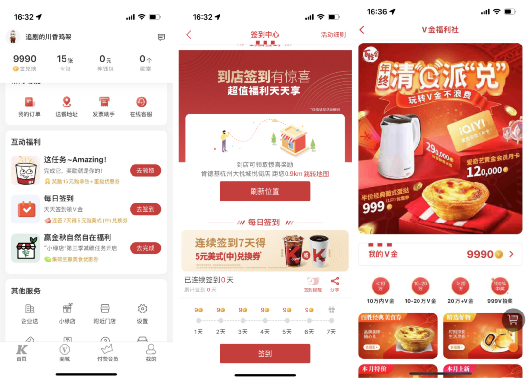 肯德基的积分称为“V金”,用户可以通过消费(消费1元=100V金)、签到等方式积累。