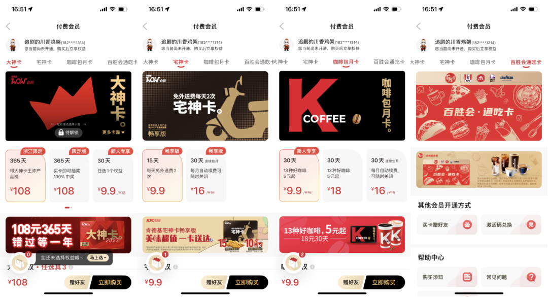 大神卡(从9.9元-108元,共有5种可选):针对经常购买肯德基的用户,可享受权益包括免外送费、早餐和下午茶套餐优惠; 宅神卡(从9.9元-16元,共有2种可选):针对经常点外卖的用户,可享受免外送费的权益;