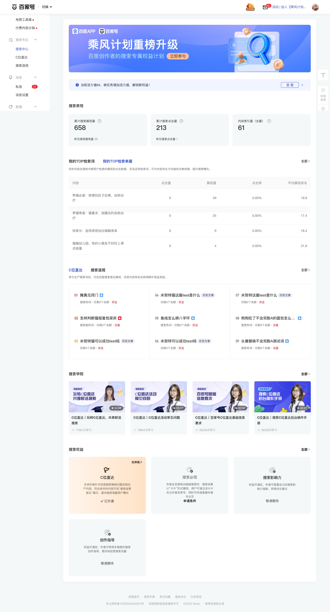 搜索专区为创作者提供一系列搜索流量表现、内容创作、权益获得、教育指引的创作经营工具。