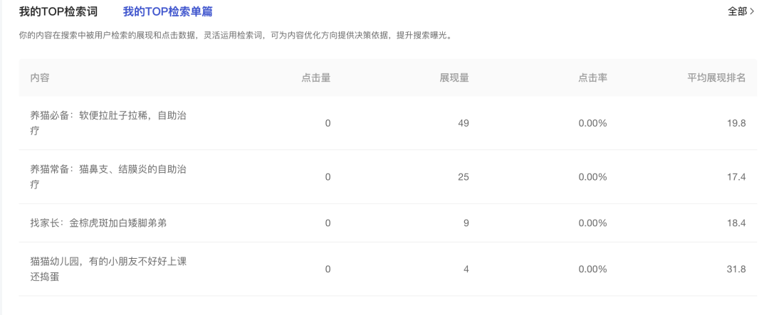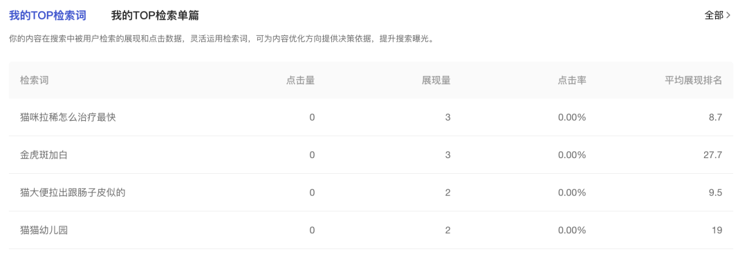 (1)搜索是用户的主动查询行为,TOP检索词呈现了您的账号内容,在搜索被用户查询的情况。
