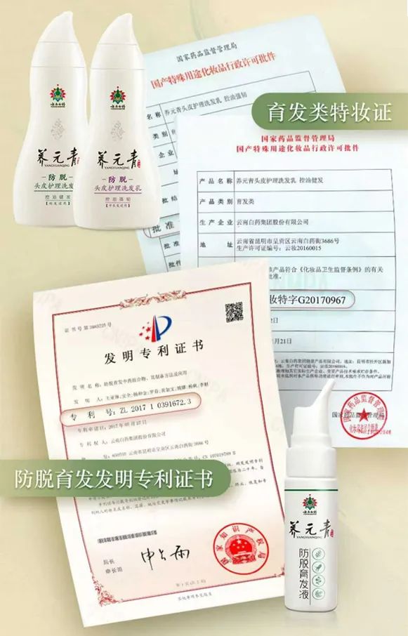 强大的产品力,让养元青持有育发类特妆证和防脱育发发明专利证书,利用权威背书打造了“信任状”。