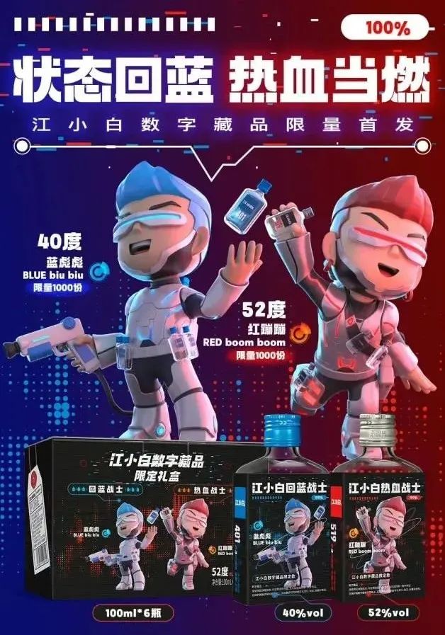 早在今年2月份,江小白就合作天猫,以“限量买赠”的形式推出数字藏品——以江小白的IP形象为蓝本创作的“蓝彪彪”和“红蹦蹦”,分别配上6瓶40度100毫升装的江小白401和52度100毫升装的江小白519,共计2000份。