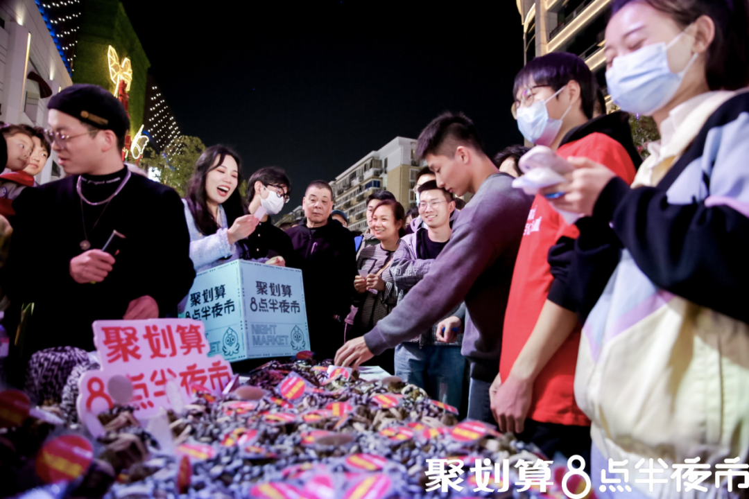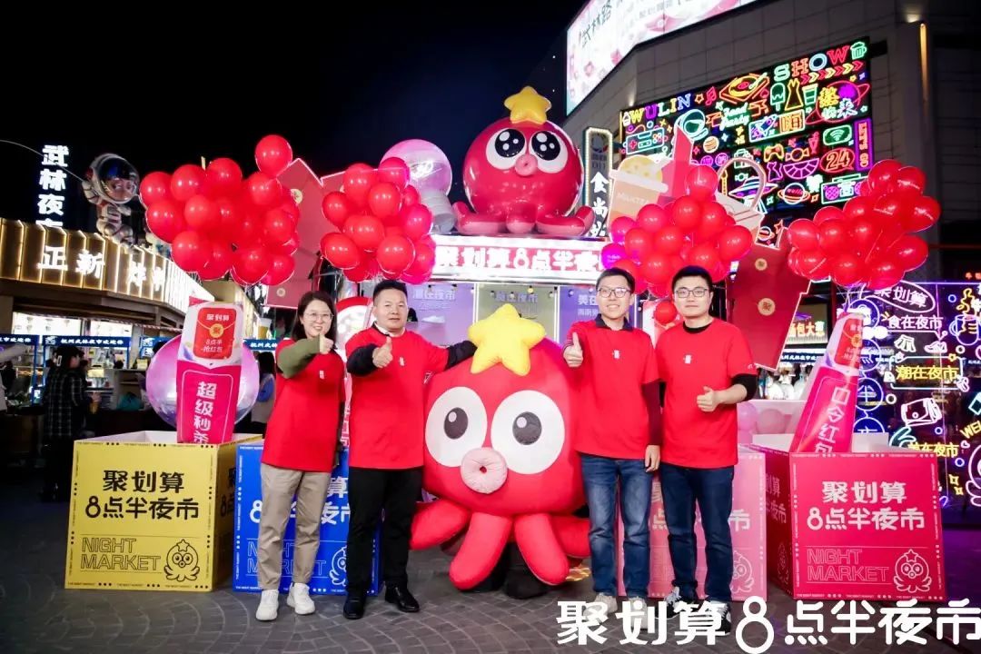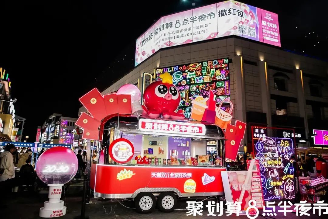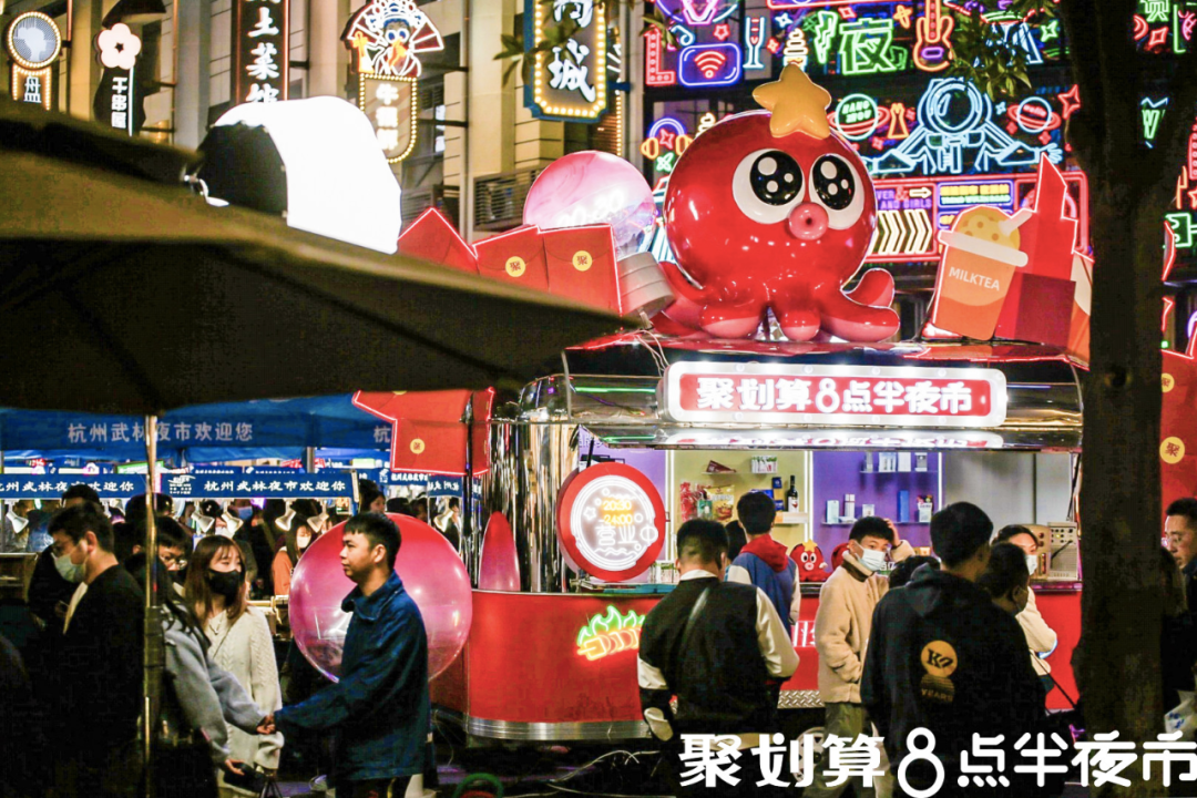 正是精准洞察到这群人的消费需求,聚划算将标志性吉祥物“章小聚”以巨型花车的形式,入驻杭州网红夜市“武林夜市”,以此来撬动年轻代的夜间消费力,开辟“夜市经济”价值蓝海。