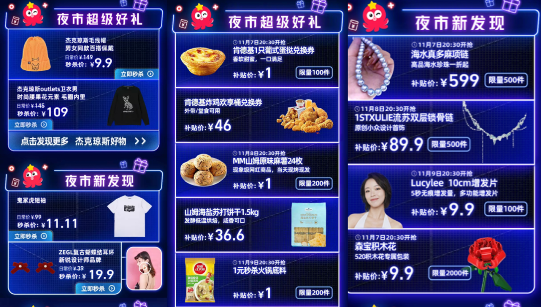 另一方面, 聚划算还推出了1元山姆原味麻薯、1月KFC葡式蛋挞、9.9元New Balance 棒球帽、9.9元雅顿粉胶、11.11元鬼冢虎板鞋鞥爆款秒杀活动,将夜市氛围感拉满。另外,“聚划算夜市”口令红包也将线下热度蔓延至线上直播间,增强了好玩、好逛的夜市体验感。