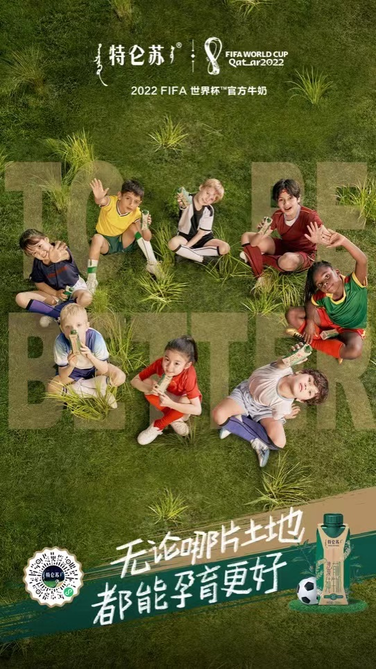 在卡塔尔世界杯倒计时30天之际,特仑苏就推出了以“32国草语”为主题的典藏礼盒。而在同期发布的宣传短片中,观众也通过一颗从乌兰布出发,飞过各个国家最终到达卡塔尔的足球,看到英国的四叶草、瑞士的雪绒花、德国的矢车菊、法国的薰衣草、卡塔尔的骆驼刺等32个参与世界杯国家的代表性植物,在场景化的表达中感知到了品牌想要传递的“无论哪片土地,都能孕育更好”的理念。