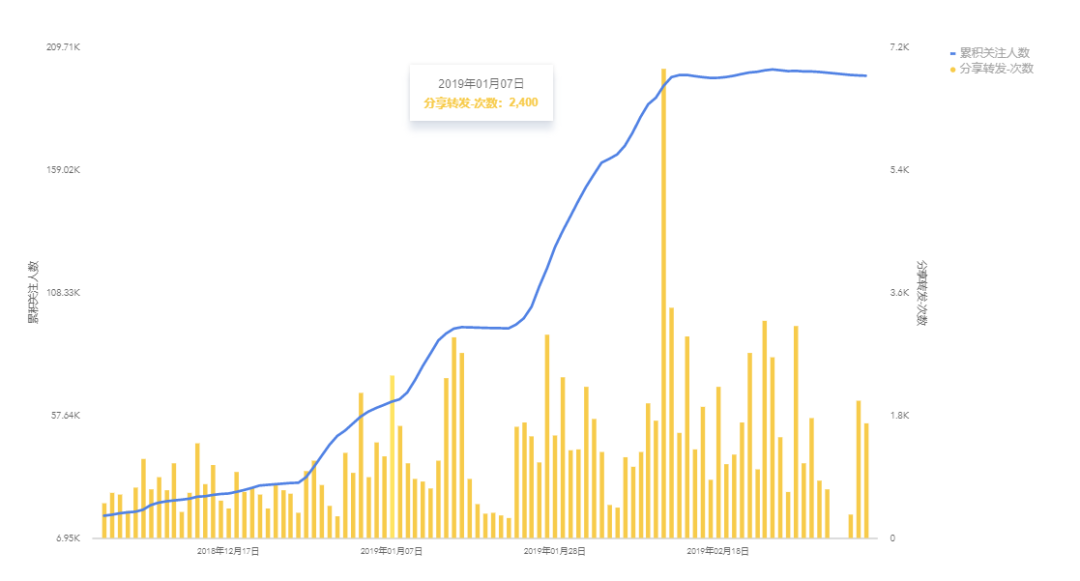 (账号分享数据图,柱状图是分享转发次数,线条是累积关注人数)