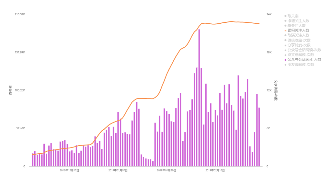 我们先来看下公众号后台的涨粉数据,这是2018年12月1日至2019年2月28日期间的累积关注人数折线图,3个月时间,涨粉近20万。