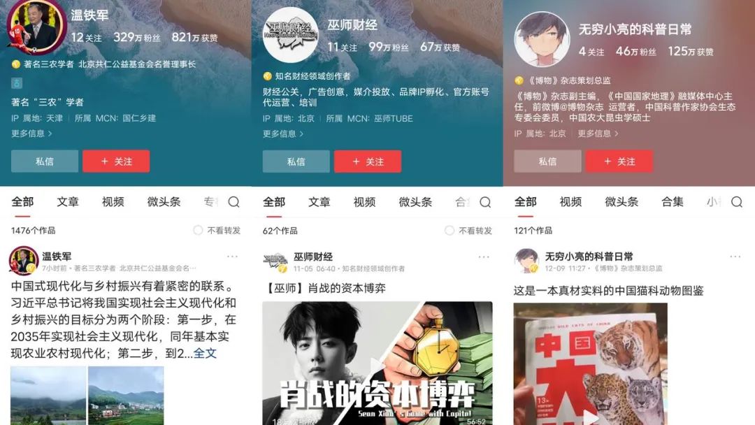 例如拥有329万粉丝的著名三农学者“温铁军”善于将乡村振兴、生态化建设等宏观大事拆解成生活小事,用通俗易懂的语言完成知识传播;还有从专业视角剖析宏观经济大势的“巫师财经”,极少追热点,用更长的时间和更多的精力打磨长尾内容;科普圈“顶流”无穷小亮入驻头条后,凭借扎实的博物学积累和对热点的敏锐度持续输出优质视频内容,让更多用户爱上自然科普。