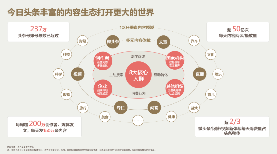 《2022今日头条营销价值洞察报告》(以下简称报告)显示,今日头条每日有150万条内容被发布,每天的内容阅读/播放量超50亿。海量的内容,来自于平台不同身份背景的创作者们——目前平台内入驻的头条号账号达237万,他们中有权威专业的专家学者,有幽默风趣的网红创作者,还有深耕数码、科技等垂类的圈层达人,他们用适合自己风格又能传递知识的表达方式,收获了粉丝的关注和认可。