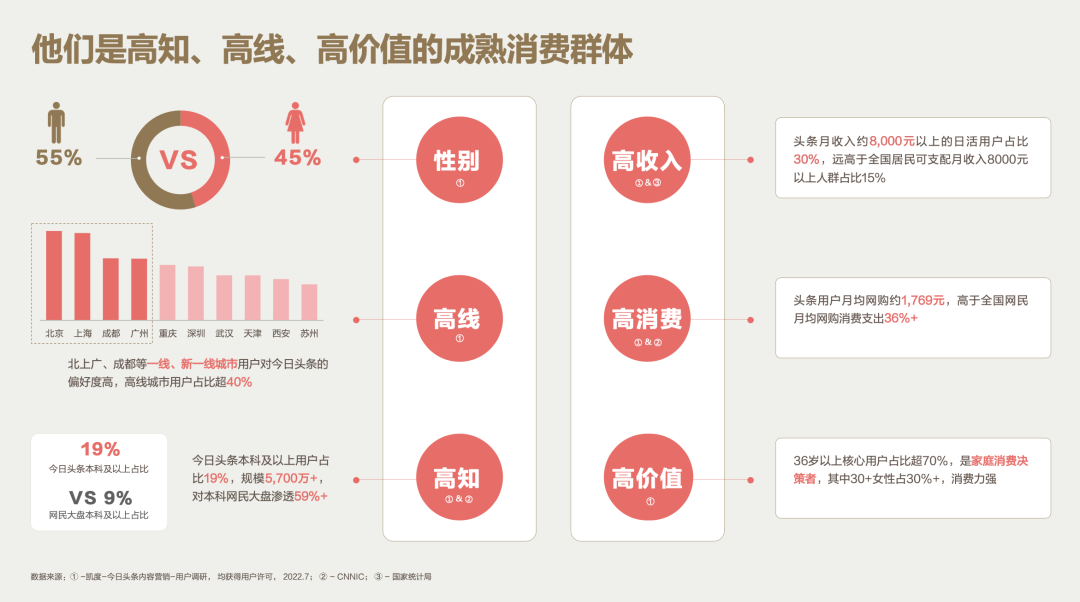 从用户的构成来看,今日头条男性用户占比55%,女性用户占比45%,36岁以上核心用户占比超70%,是家庭消费的主要决策者。地域分布上,北京、上海、成都、广州等一线、新一线用户对今日头条的偏好度更高,高线城市用户占比超40%。学历上,本科以上占比19%,月均收入、线上消费力远高于网民大盘。