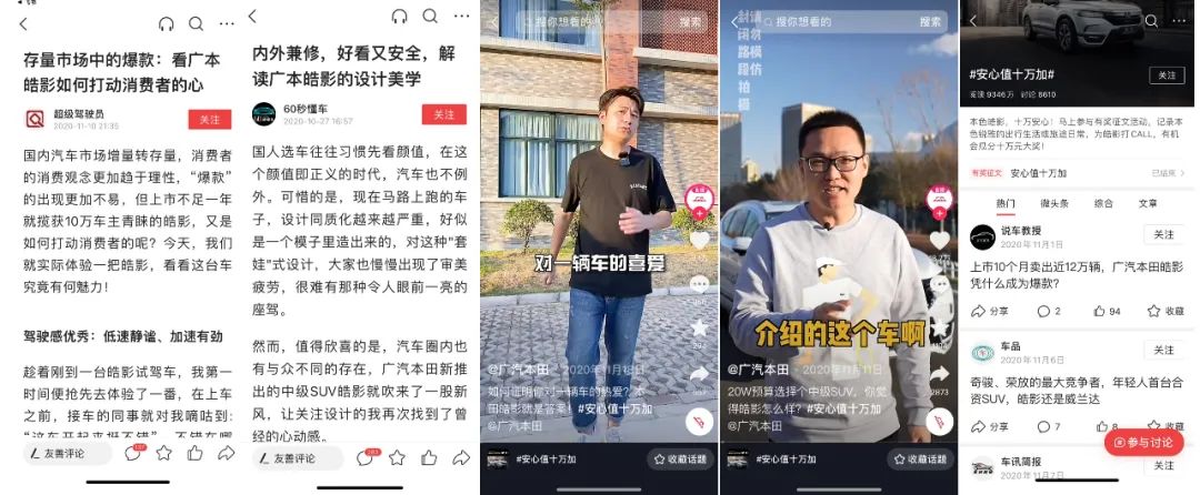 具体到实际操作中,广汽本田皓影与今日头条《众说好车》项目的合作便是“一站式服务”的典型案例——投前,巨量云图诊断发现子品牌皓影在头、抖双端的用户评论净情感值低于行业品牌均值,且安全性的负向属性较低,基于这一痛点,头条、抖音双端联动,发起话题#安心值十万加#,并邀请优质创作者在话题下进行产品深度解读,精准、长效辐射潜在人群。项目结束后,头、抖双端的用户情感值分别提升了32.6%、72.7%。