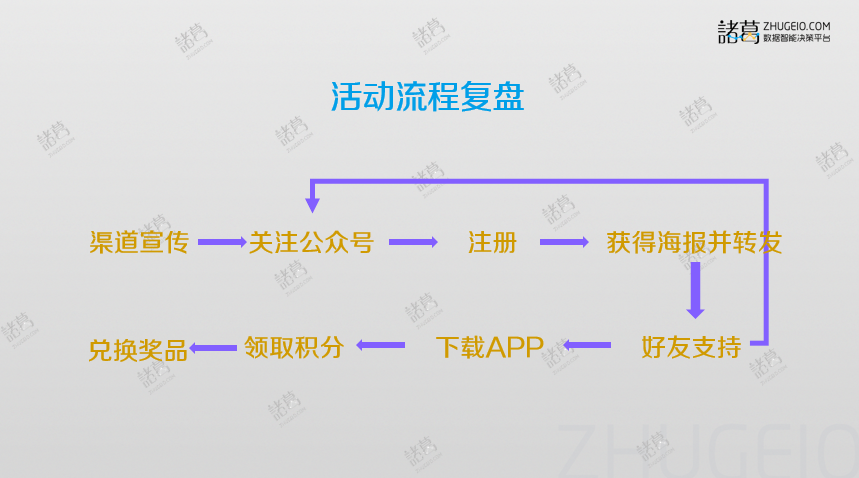 用户从了解活动信息并参加活动,到领取奖品活动完成,总共需要9步,整个流程可以完成3个指标,公众号粉丝新增、APP注册新增、APP下载新增及激活,顺带还能提升积分兑换的参与度,实物奖品还能获得用户的地址信息。