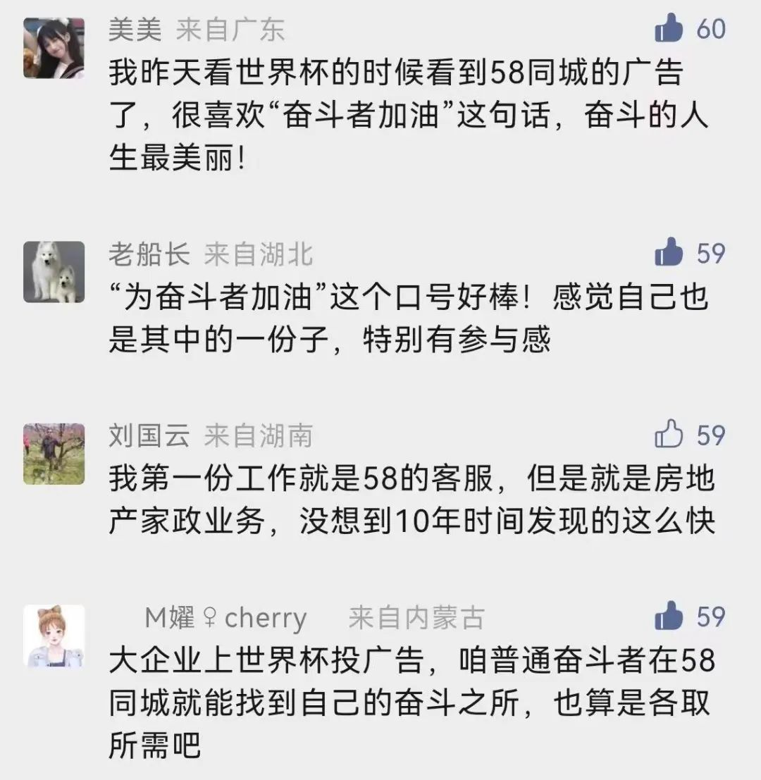 比如一条58同城在央视世界杯转播时段投放的广告,就引起了广泛的讨论,网友评价很喜欢、特别有参与感。