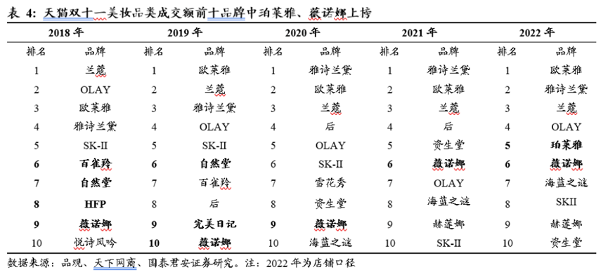 在高端美妆市场,国际品牌的地位或许在很长的一段时间内都很难被撼动。拿今年天猫双十一美妆品类成交额前十品牌看,国货品牌仅有珀莱雅、薇诺娜挤进榜单第五、第六,Euromonitor数据显示,自2019年以来,高端化妆品市场份额前三位置就被欧莱雅、雅诗兰黛、LVMH牢牢把持,2021年上述品牌市占率分别达18.4%、14.4%、8.8%。