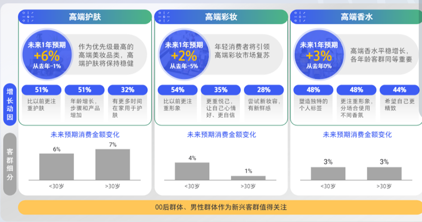 - 伴随既有客群的进阶,“00后、男性、下沉市场”也构成了新的高端美妆消费大军,他们或由高端护肤切入高端彩妆,或在人情送礼中被新品种草……