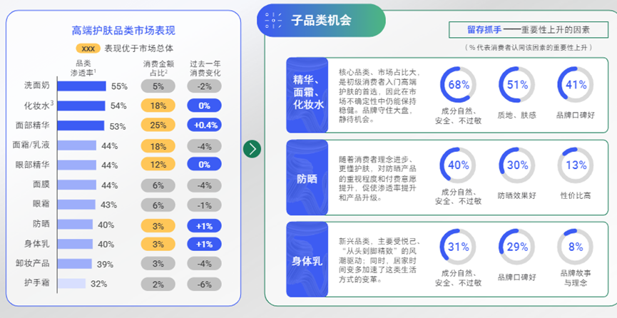 - 第一类是新手入门高端护肤的首选产品,包括化妆水、面部精华、面霜/乳液、眼部精华,因为此类同时也是区隔品牌资产的核心品类,需求稳健,消费者最认同的因素是成分自然安全不过敏(68%)、质地及肤感(51%)、品牌口碑好(41%);