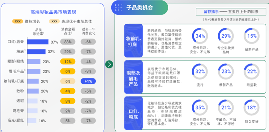 - 第一类是由新妆容方式(口罩妆/眼部妆容)带动的新品类,眼影/眼线、眉毛产品,该品类消费者最认同产品是否符合流行趋势(32%)、上新(23%)及限量(22%);