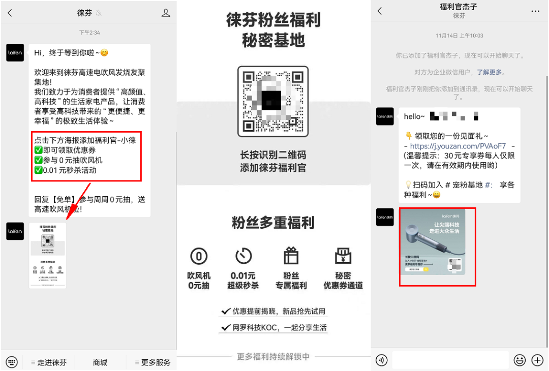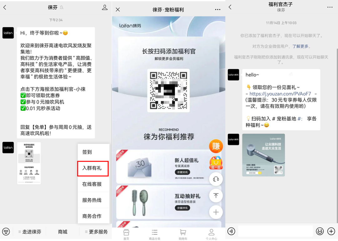 路径一:在关注徕芬官方公众号后,即可收到「徕芬福利官」企业微信二维码,通过福利引导用户添加,再进一步引导添加社群。