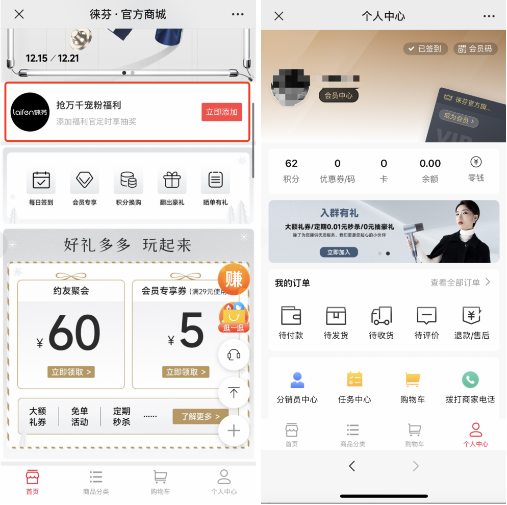 路径三:点击徕芬公众号菜单栏「商城」,跳转商城H5页面。在「首页」和「个人中心」页面都设置了引流私域的触点,添加徕芬福利官企业微信,再进一步引导进入社群。