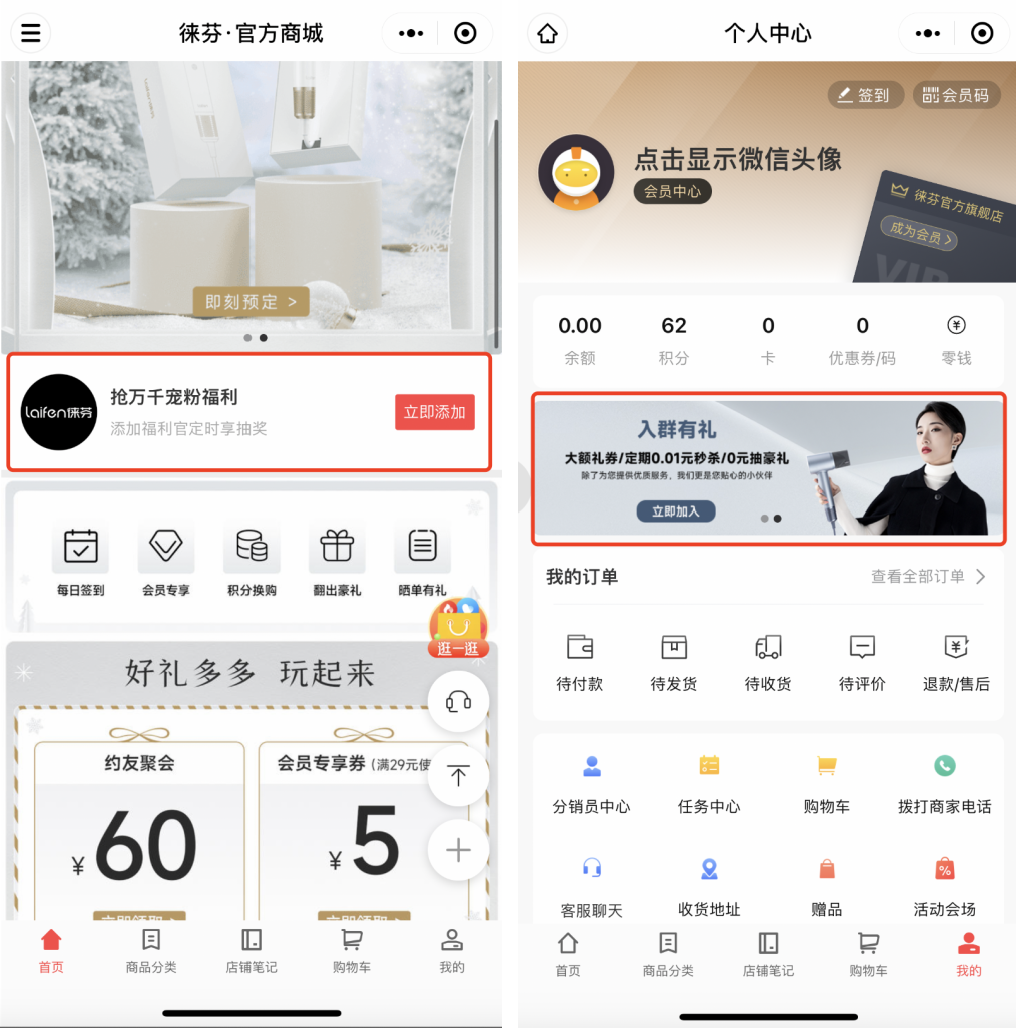 在徕芬的小程序「徕芬官方商城」,「首页」和「我的」页面中都设置了私域触点,添加福利官即可进入社群。