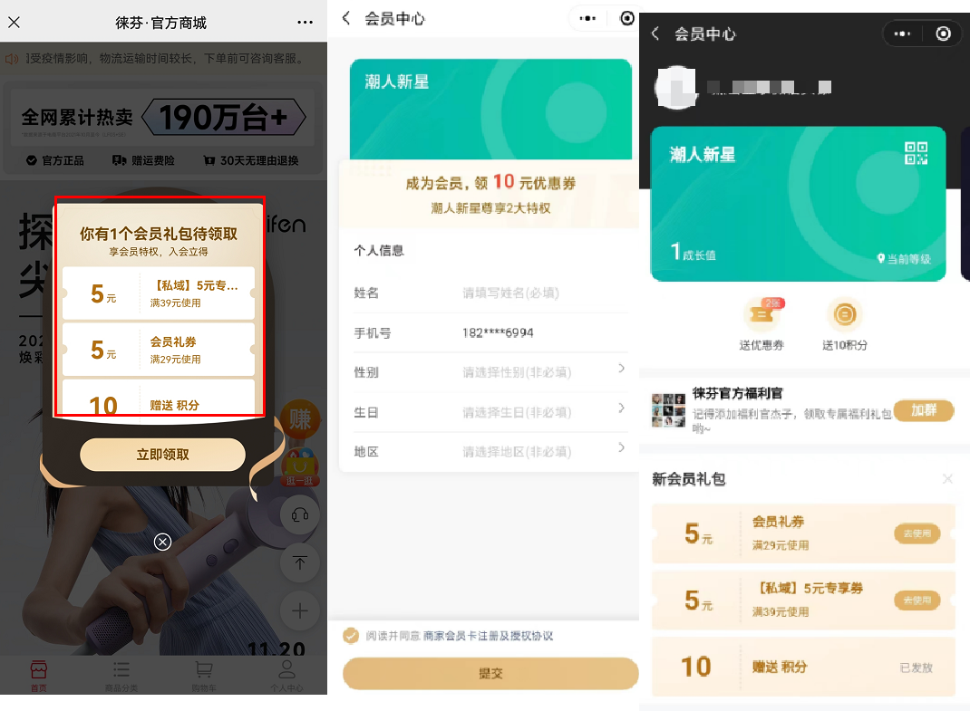 值得一说的是,新用户在进入小程序的第一时间,会弹出优惠礼包,点击领取会跳转会员中心填写个人信息,填写后会跳转会员中心页面,再引导用户加群。