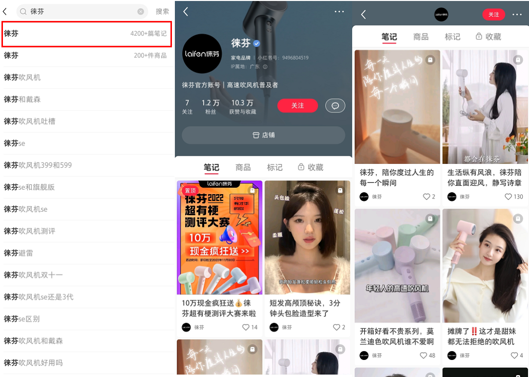 徕芬在小红书中的相关笔记4500+篇,官方账号粉丝达到1.2万,笔记内容以产品种草、活动为主。在账号主页设置了店铺链接,进一步引导种草转化。