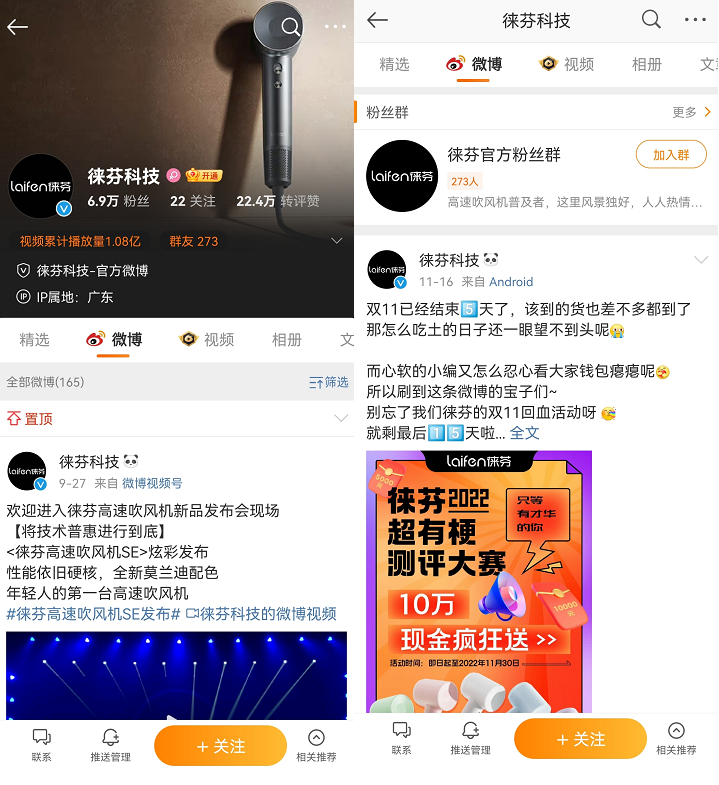 徕芬在微博粉丝达到6.9万,发布频率一个月10条左右,内容主要以品宣、活动推广、节日祝福、有奖互动等为主。另外用户可以申请进入徕芬官方粉丝群。