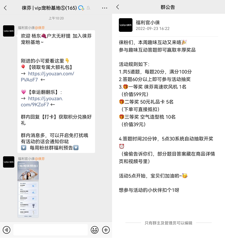 而徕芬的社群从规划到内容再到服务都做得不错,定位明确,内容清晰,服务及时,能让用户一进来就知道群是干什么的,自己能获得什么,又能做什么。下面以我加入的社群为例: