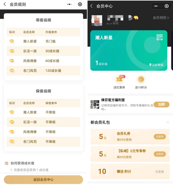 小程序会员分为4个等级:潮人新星(无门槛)、乐活一族(30成长值)、风格偶像(60成长值)、名门风范(120成长值),会员主要权益包括送优惠券和送积分。