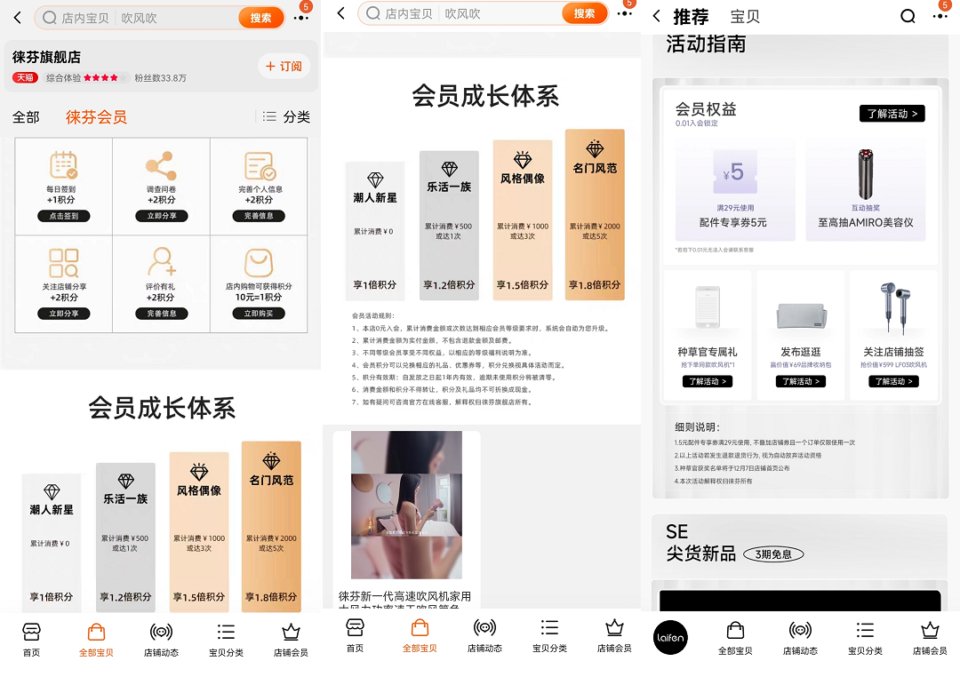 徕芬在微信小程序和电商平台中设置会员体系,两者都是以成长会员+积分体系为主,福利的内容略微会有不同。