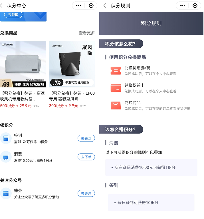 积分体系:徕芬积分可签到、填写调查问卷、完善个人信息、评价有礼和消费等方式获得,积分可兑换相关商品。