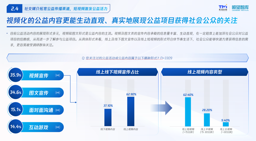 随着数字化基建的成熟,信息承载量更丰富的短视频日渐成为主流,这一变化也影响到了公益传播。腾讯营销洞察(TMI)与瞭望智库联合发布的《2022公益行为数字化洞察报告》显示,视频宣传成为公众了解公益活动或内容的首选形式,其中小于15分钟的线上短视频占比高达62.4%。